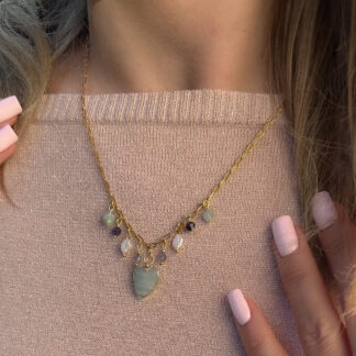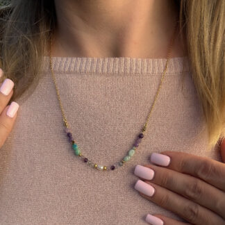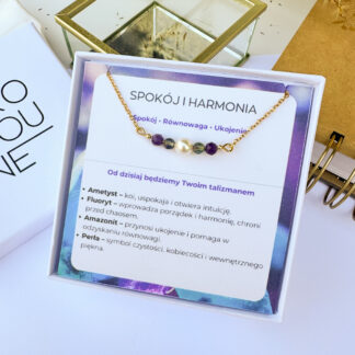 Naszyjnik harmonii z naturalnych kamieni – ametyst, fluoryt, amazonit, perła