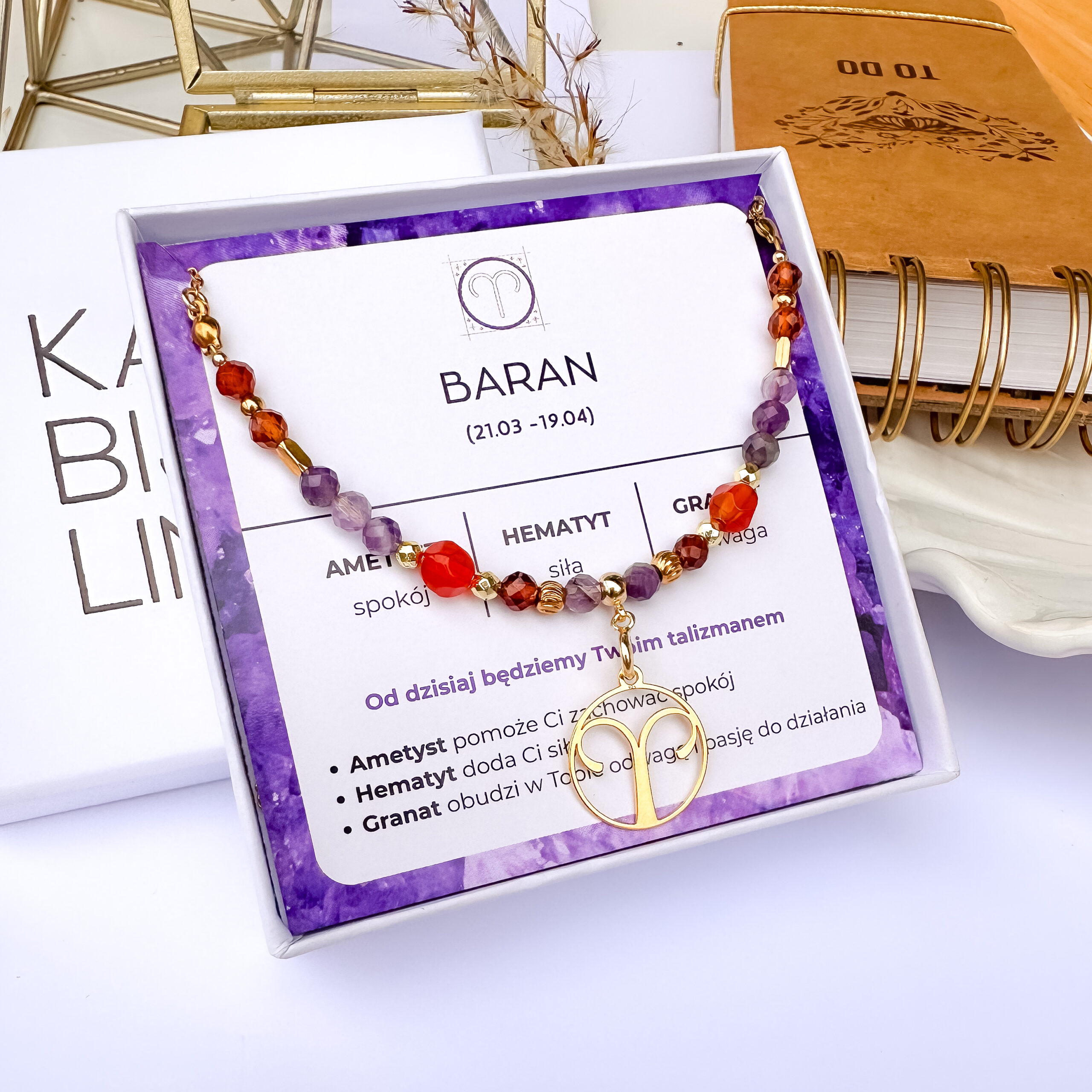 Zapakowany w pudełeczko z logiem oraz karteczką opisującą właściwości kamieni.