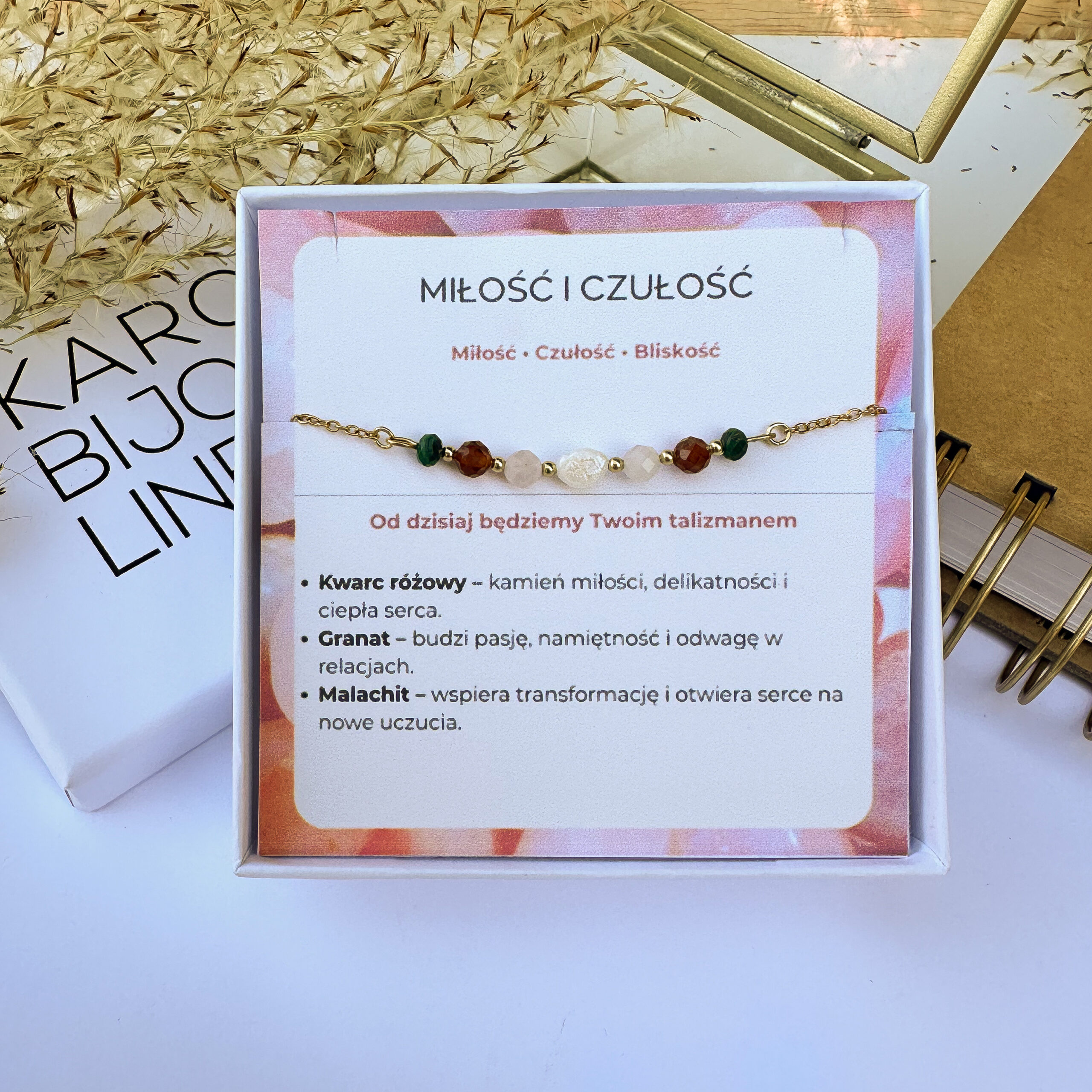 Kolekcja „Miłość i Czułość” to linia biżuterii, która otula energią serca i przypomina o sile uczuć. Wyselekcjonowane  kamienie naturalne wspierają miłość, namiętność i wewnętrzną harmonię, a dodatkowe zawieszki nadają biżuterii romantyczny, pełen blasku charakter.