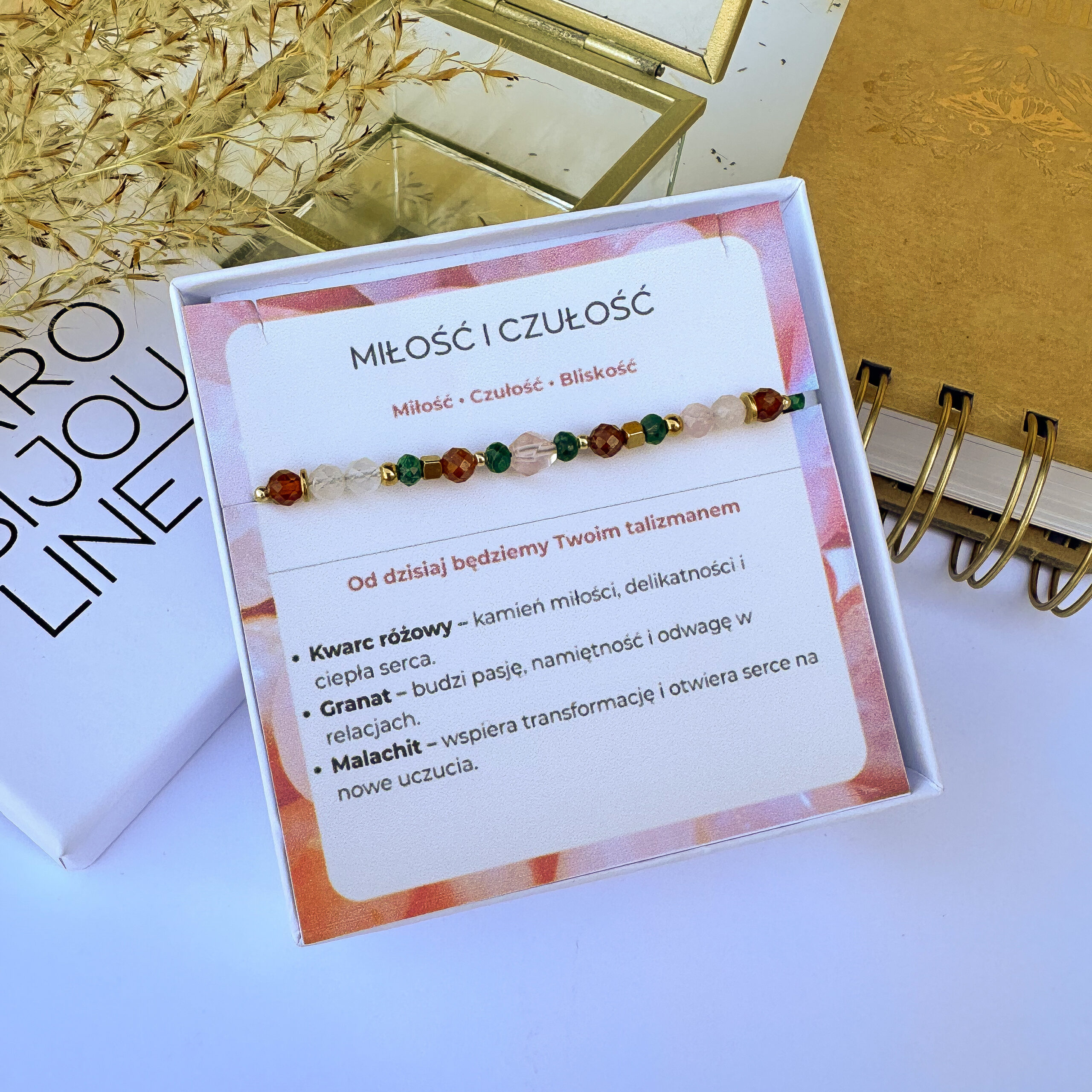 Kolekcja „Miłość i Czułość” to linia biżuterii, która otula energią serca i przypomina o sile uczuć. Wyselekcjonowane  kamienie naturalne wspierają miłość, namiętność i wewnętrzną harmonię, a dodatkowe zawieszki nadają biżuterii romantyczny, pełen blasku charakter.