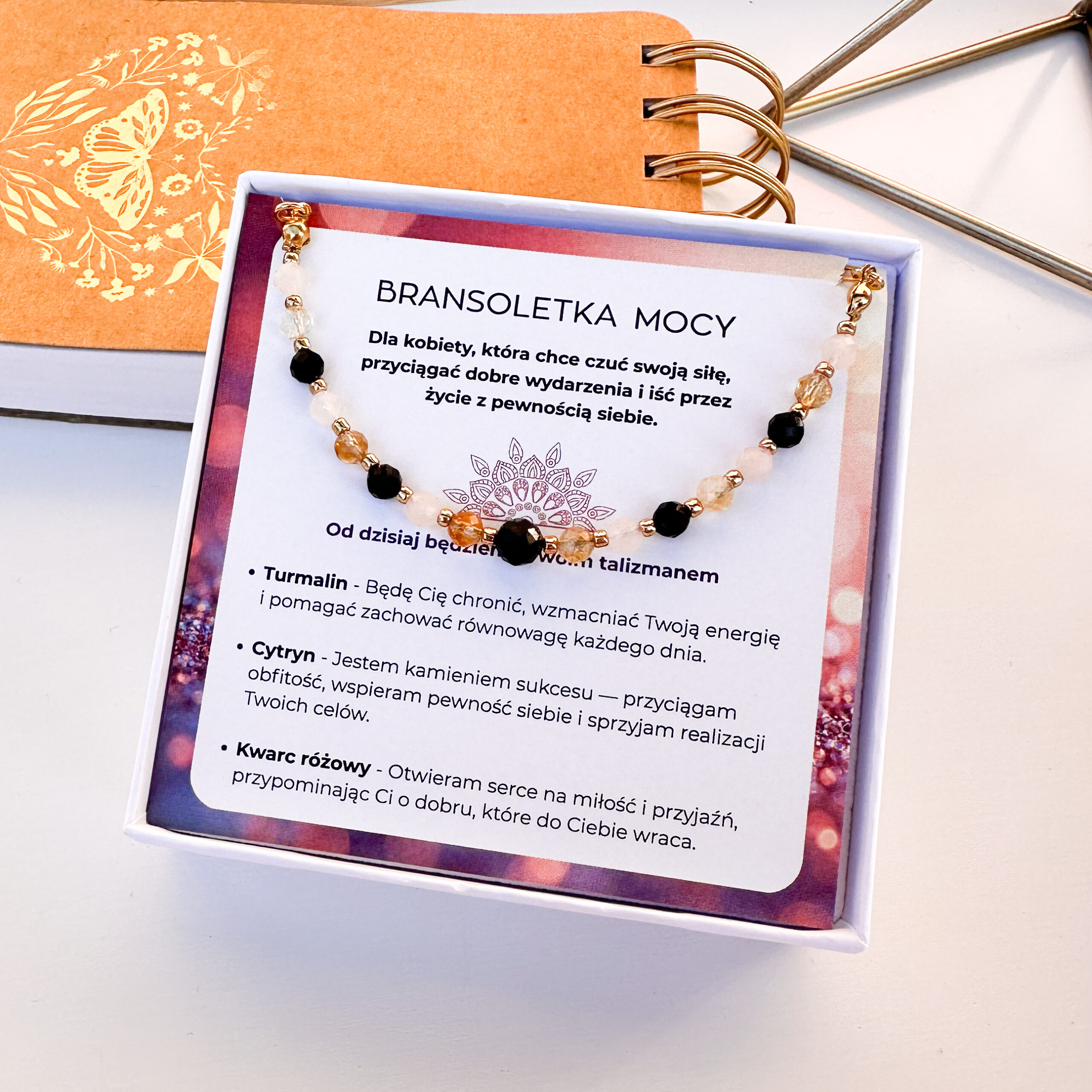 Zapakowana w pudełeczko z logiem oraz karteczką opisującą właściwości kamieni.