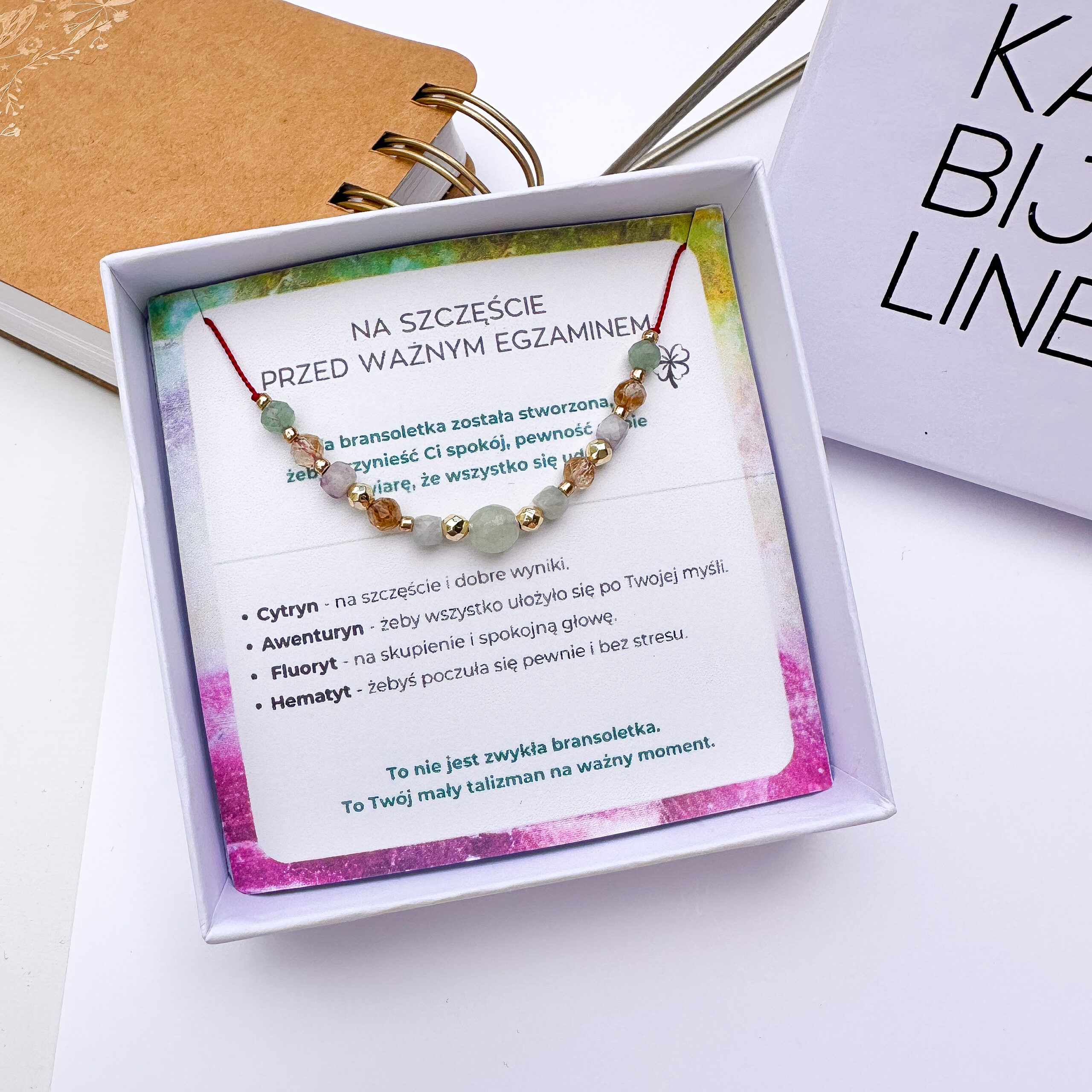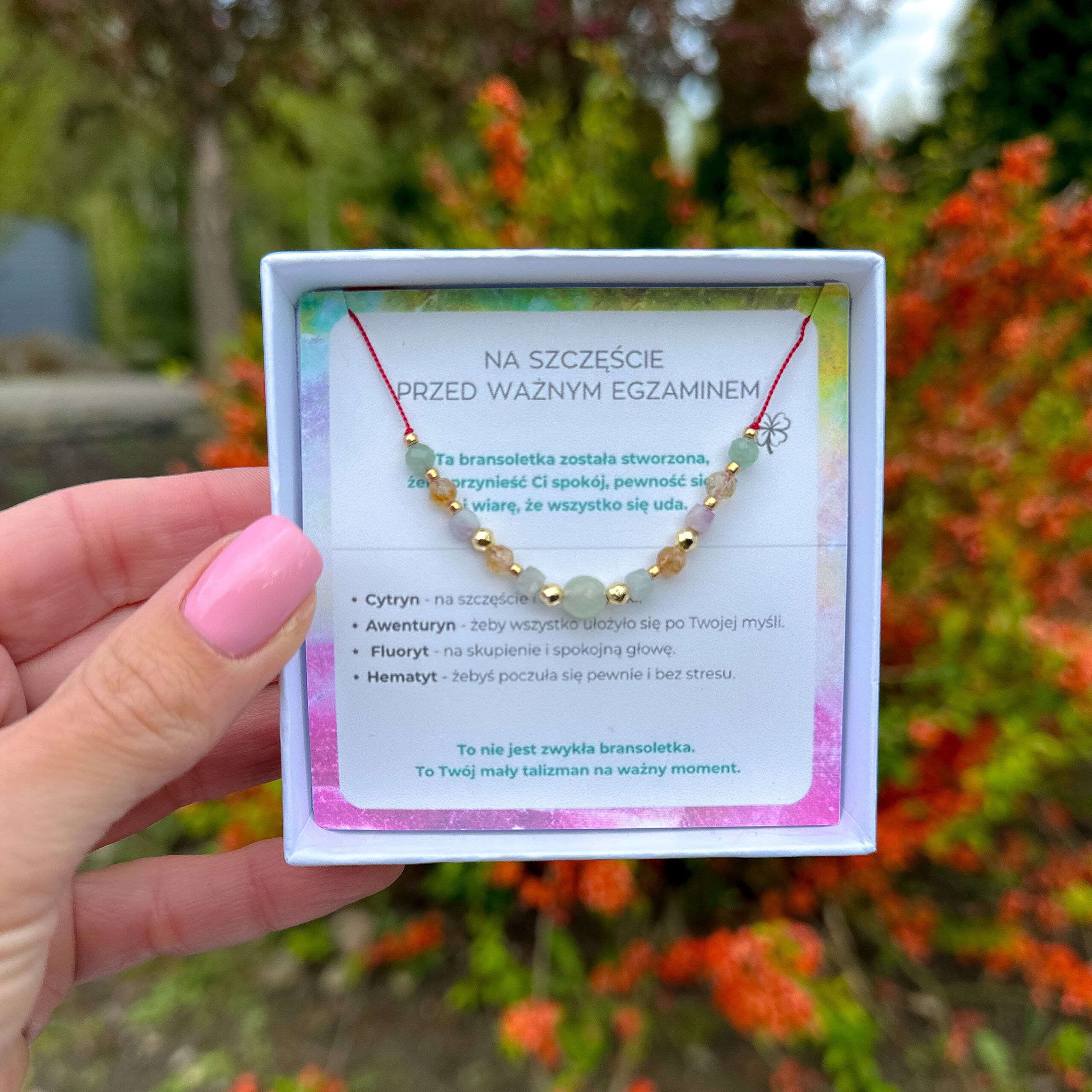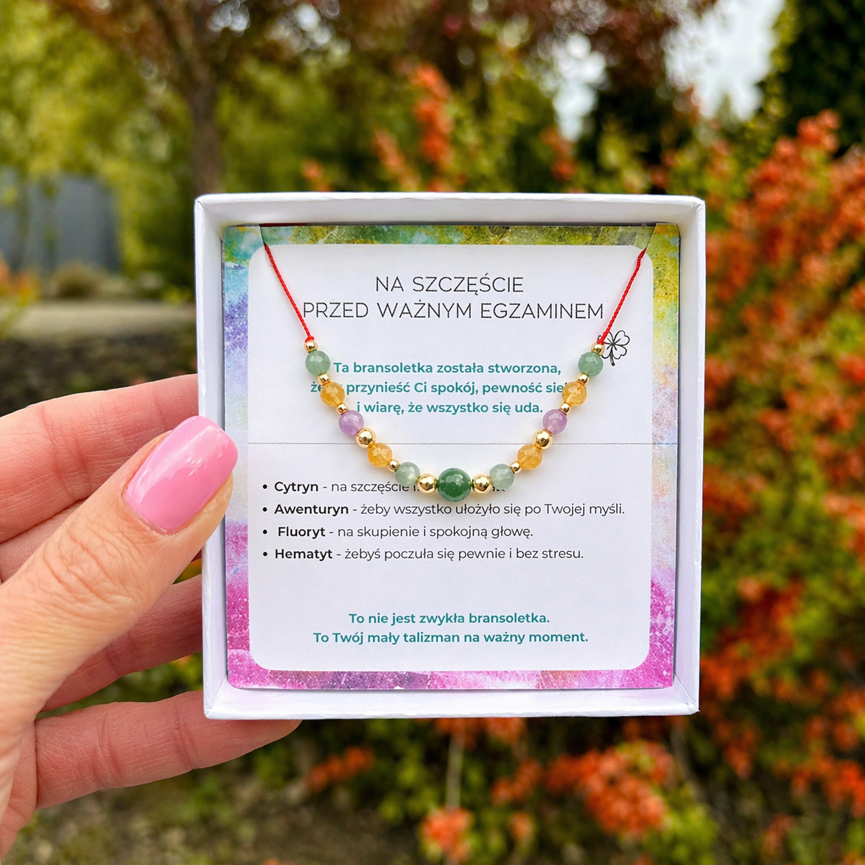Bransoletka na egzamin „Na szczęście” to wyjątkowy talizman stworzony z myślą o ważnych momentach – maturze, sesji czy innych wyzwaniach. To biżuteria, która łączy w sobie energię szczęścia, spokoju i pewności siebie.