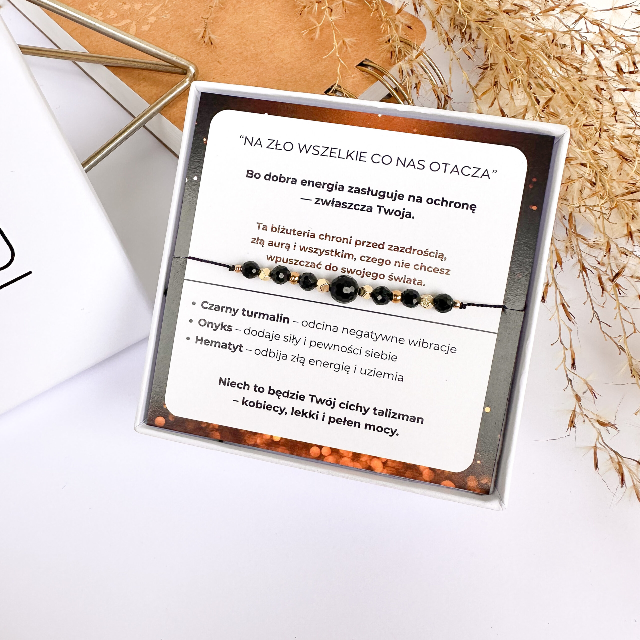 Połączenie czarnego turmalinu, onyksu i hematytu tworzy potężną ochronę przed zazdrością, złą energią i emocjonalnym chaosem.