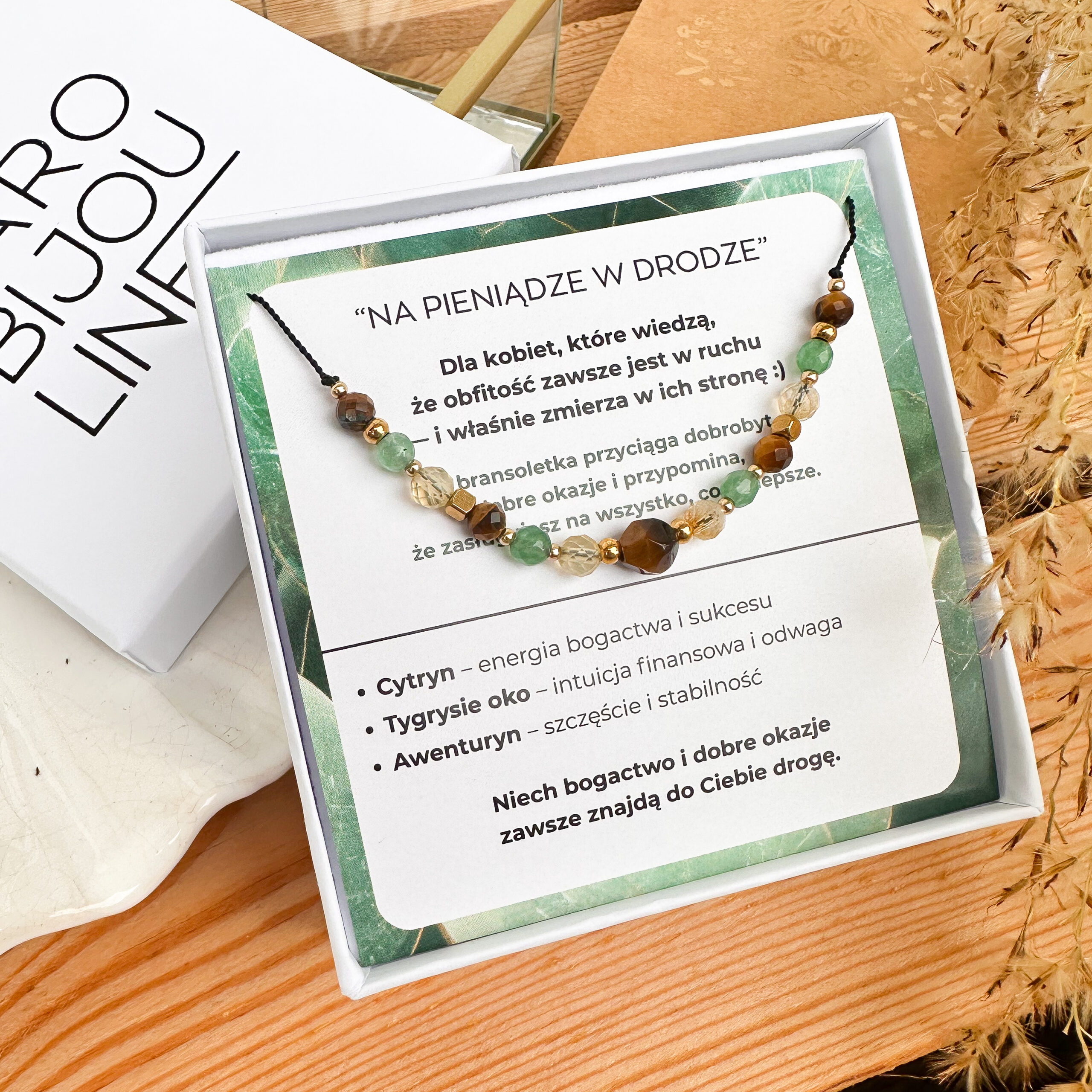 Bransoletka „Na pieniądze w drodze” to energetyczny talizman dla kobiet, które chcą przyciągać sukces, szczęście i lekkość w finansach.