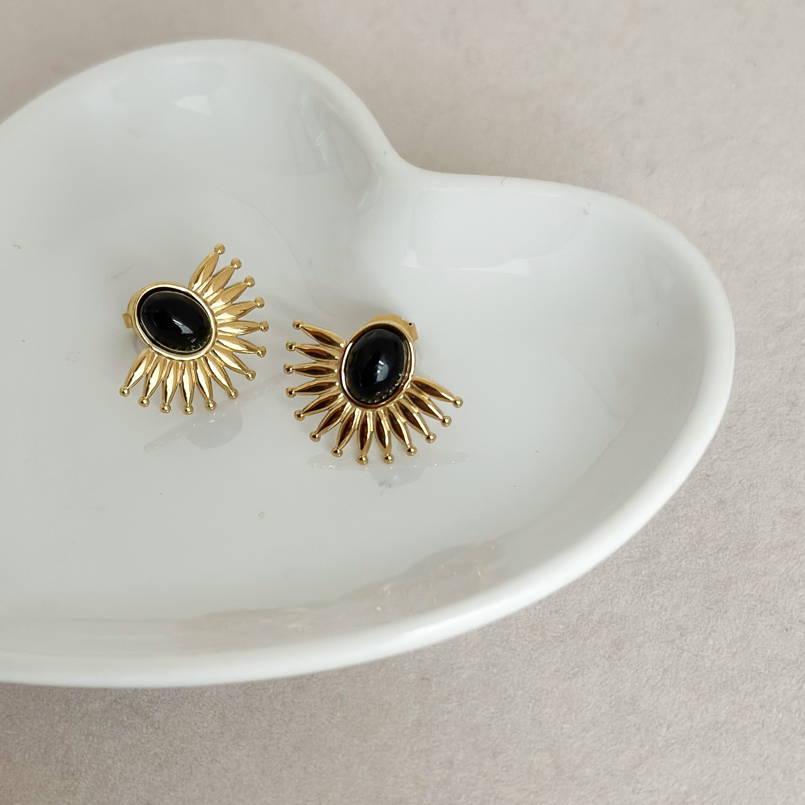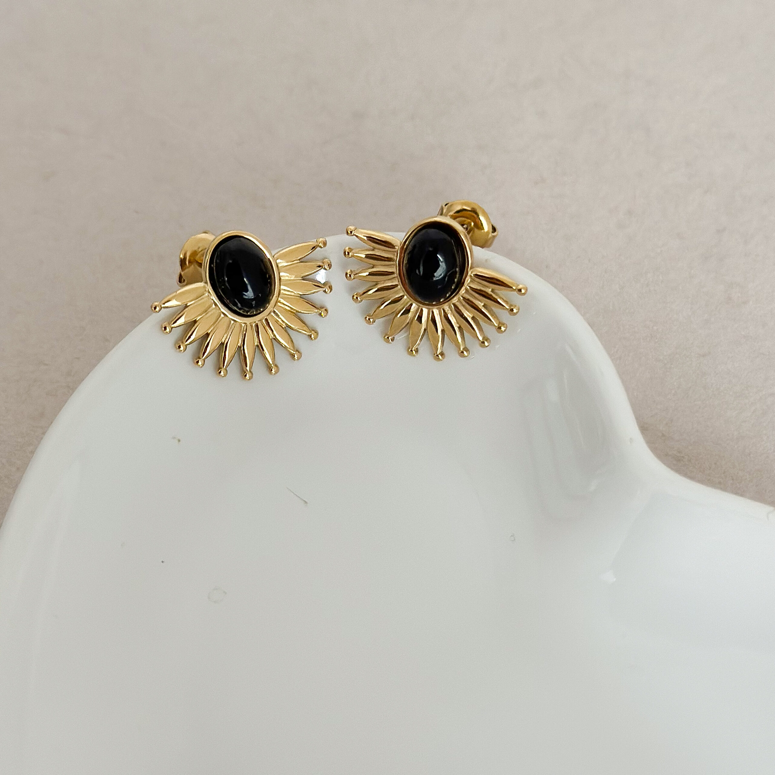 Delikatne, a zarazem wyraziste kolczyki sztyfty ze stali szlachetnej, ozdobione naturalnym onyksem. Ich kształt inspirowany promieniami słońca symbolizuje energię, siłę i wewnętrzne światło kobiety.