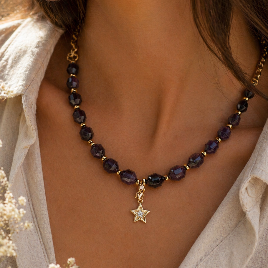 • Efekt Wow: Duże kamienie ametystu w połączeniu z lśniącą gwiazdką tworzą wyrazisty, luksusowy dodatek, który przyciąga wzrok.