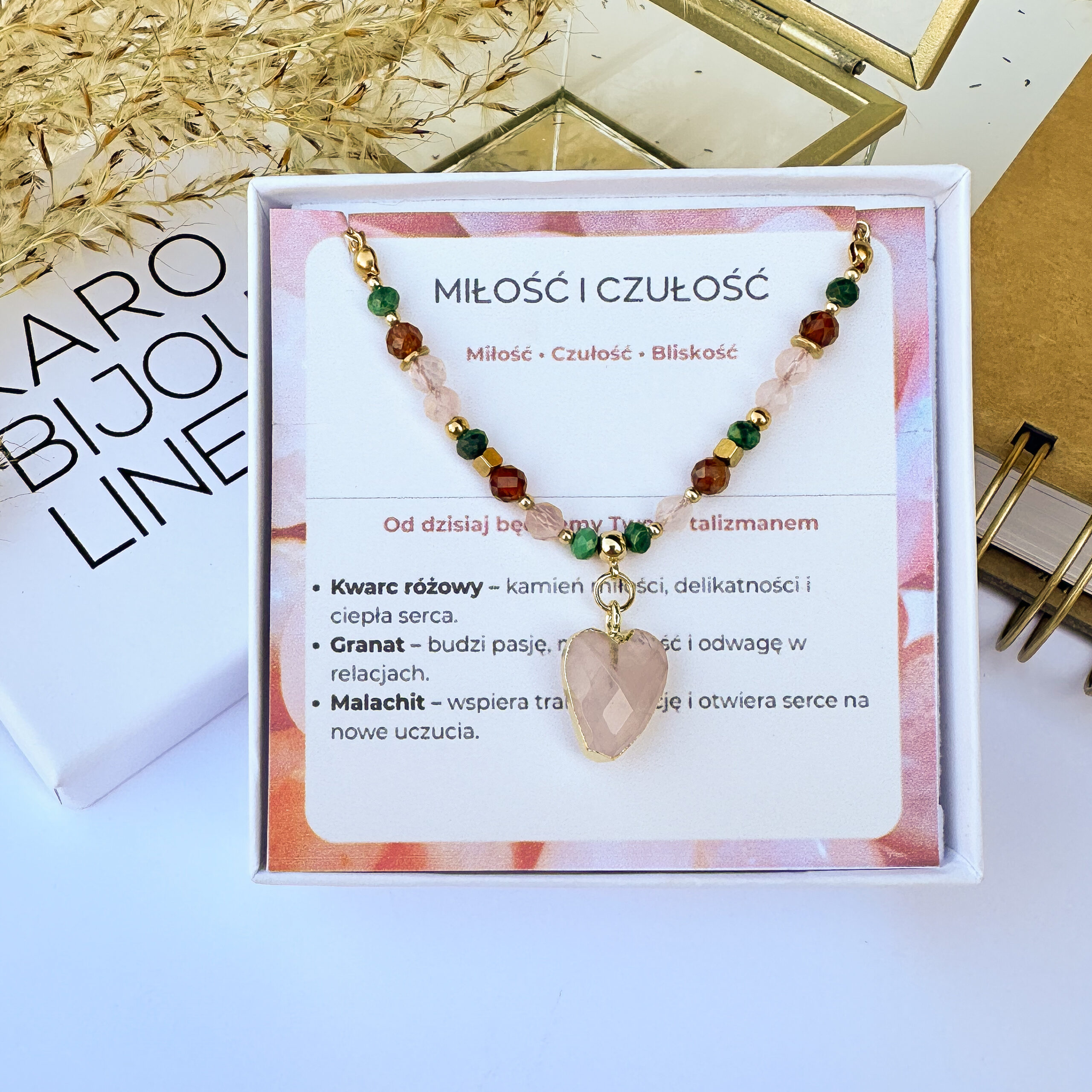 Kolekcja „Miłość i Czułość” to linia biżuterii, która otula energią serca i przypomina o sile uczuć. Wyselekcjonowane kamienie naturalne wspierają miłość, namiętność i wewnętrzną harmonię, a dodatkowe zawieszki nadają biżuterii romantyczny, pełen blasku charakter.