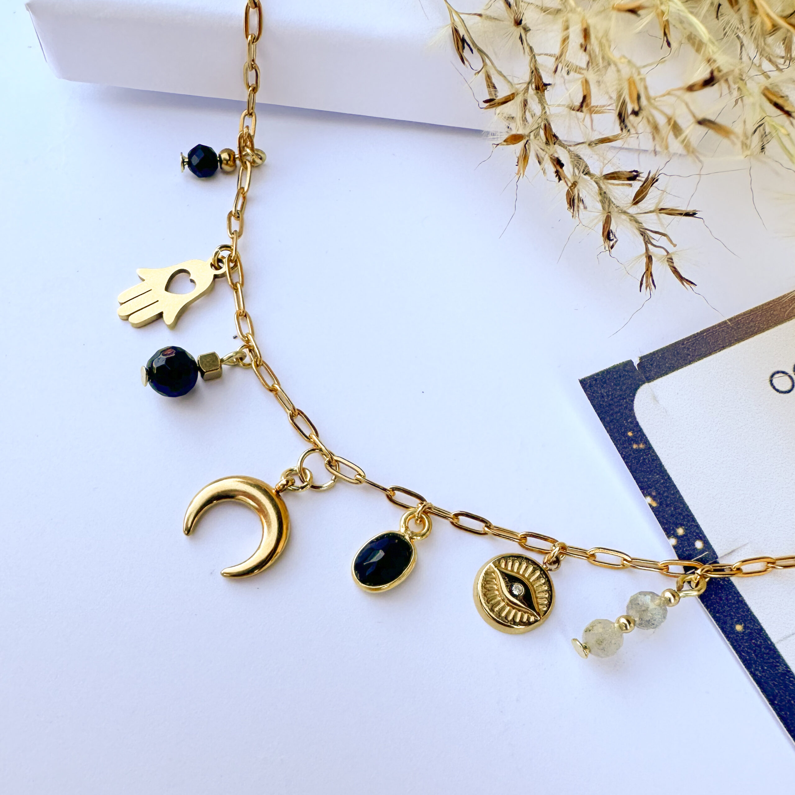 Naszyjnik ochronny z naturalnych kamieni i zawieszkami oko proroka, hamsa, lunula