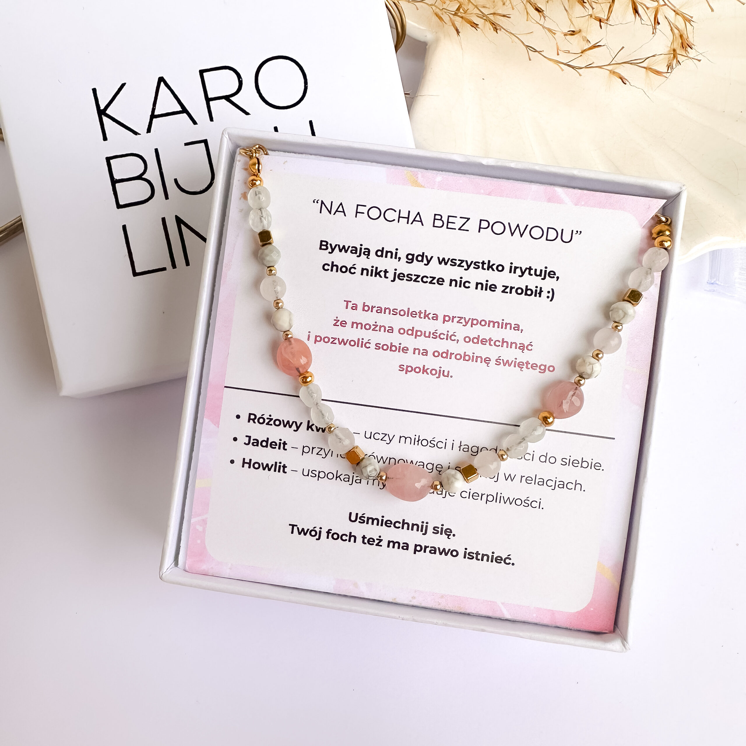 Naszyjnik „Na focha bez powodu” to delikatna mieszanka kamieni, które przynoszą spokój, harmonię i przypominają, że masz prawo do emocji (nawet tych bez powodu).