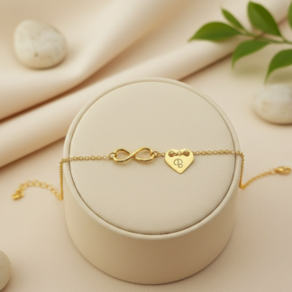 Pozłacana bransoletka z grawerem– serce, nieskończoność i stópka