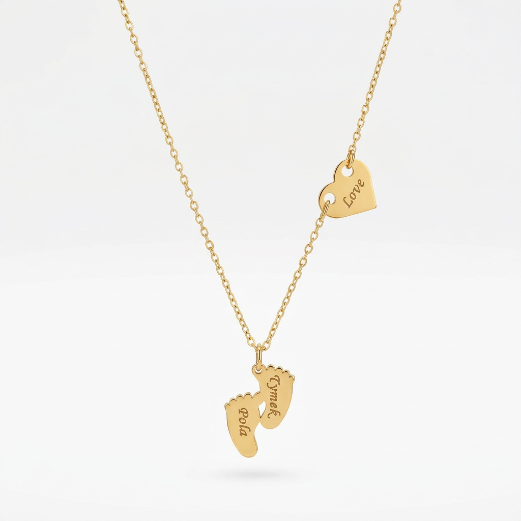 Pozłacany naszyjnik – grawerowane stópki i serce