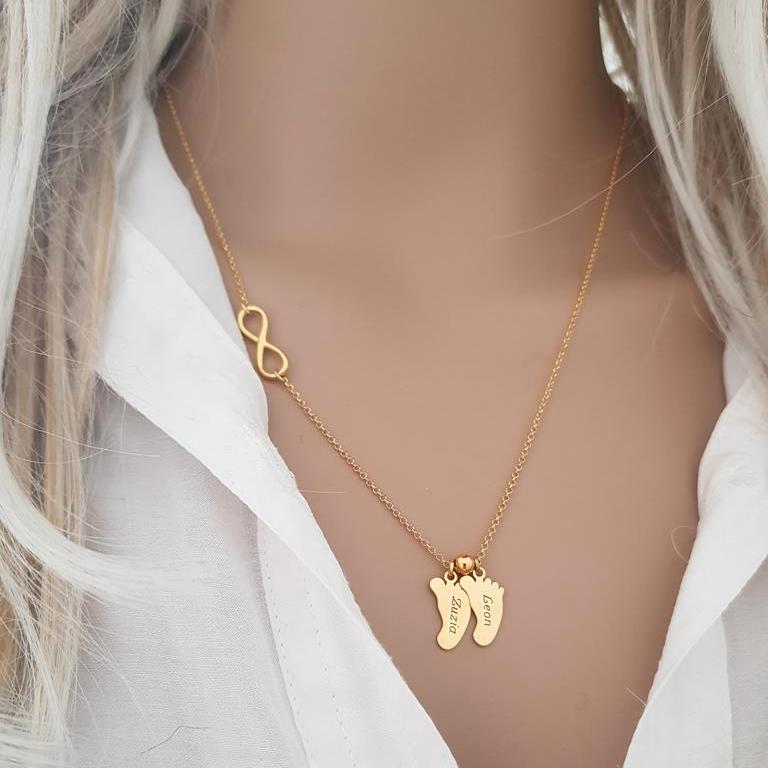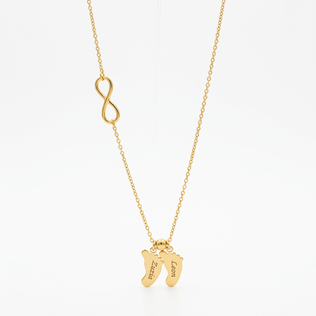 Pozłacany naszyjnik celebrytka – grawerowane stópki i symbol nieskończoności