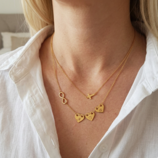 Pozłacany, podwójny naszyjnik – 2 serca z grawerem i zawieszka MAMA