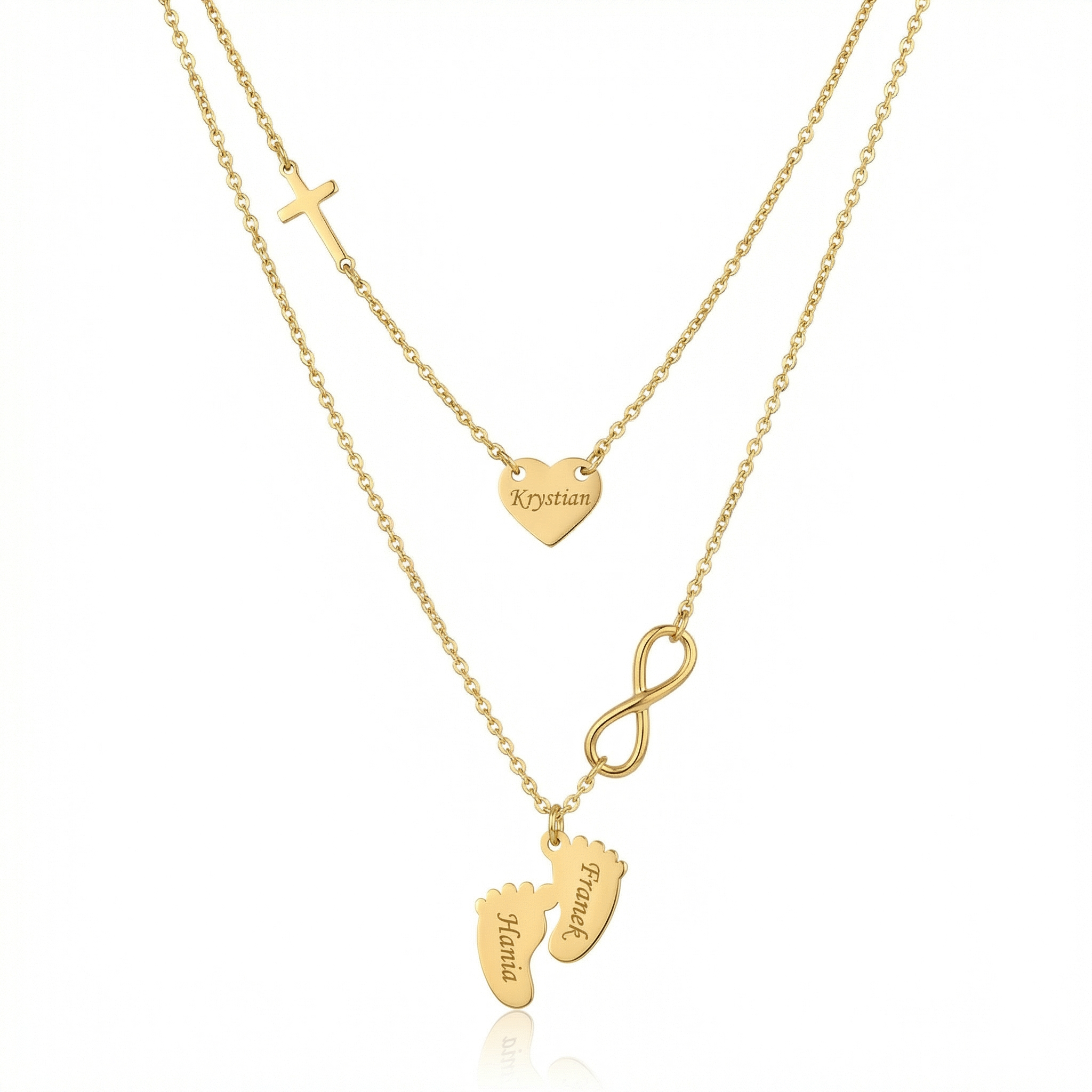 Pozłacany podwójny naszyjnik z grawerowanym sercem, krzyżykiem i zawieszką stópek