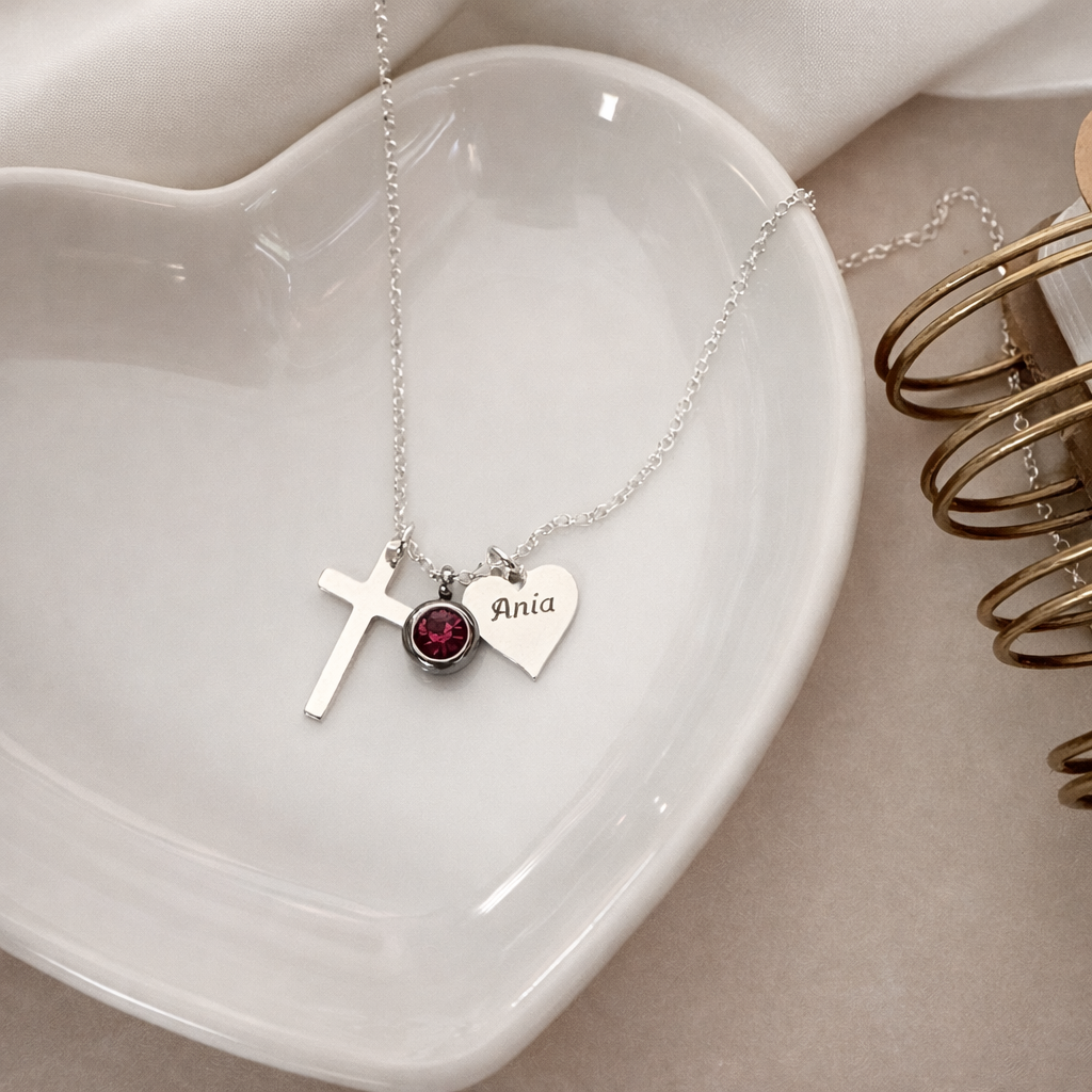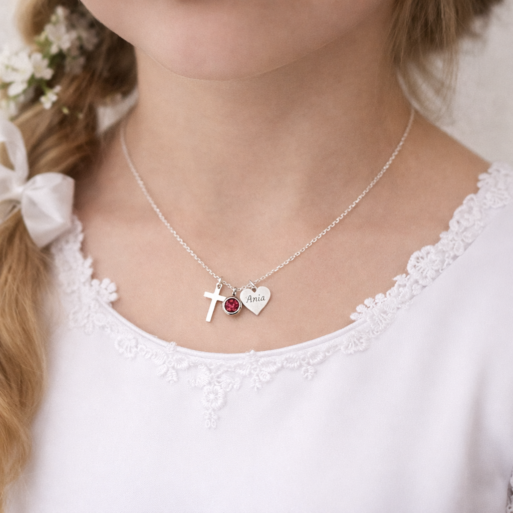 Srebrny Naszyjnik dla Dziewczynki, Krzyżyk i Serce z Grawerem na Komunię